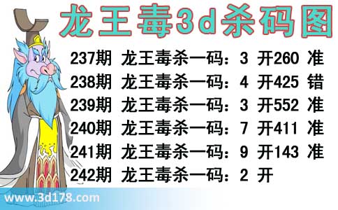 237期 龙王毒杀一码:3 开260 准238期 龙王毒杀一码:4 开425 错239期 龙王毒杀一码:3 开552 准240期 龙王毒杀一码:7 开411 准241期 龙王毒杀一码:9 开143 准242期 龙王毒杀一码:2 开
