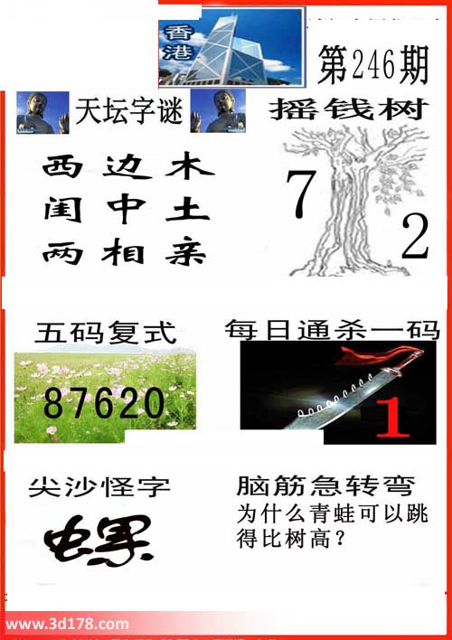 3d第2014246期香港彩报图推荐: 天坛字谜:西边木,闺中土,两相亲摇钱树:7 2五码复式:87620每日通杀一码:1尖沙怪字:螺 该香港彩报由福彩3D之家3D图库频道原创,仅供彩民参考,温馨提供。