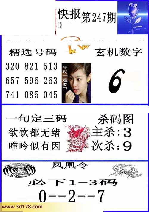3d第2014247凤凰快报推荐: 玄机数字:6精选号码:320 821 513 657 596 263 741 085 045一句定三码:欲饮都无绪唯吟似有因 杀码图:主杀:3次杀:9凤凰令:必下1-3码,0-2-7