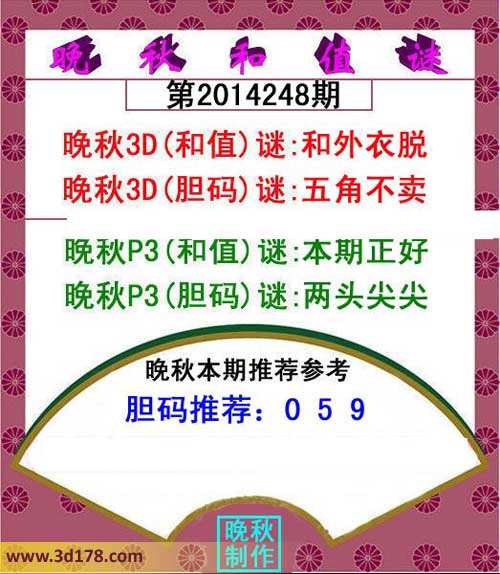 晚秋3D(和值)谜:和外衣脱晚秋3D(胆码)谜:五角不卖晚秋P3(和值)谜:本期正好晚秋P3(胆码)谜:两头尖尖胆码推荐:059