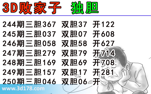 3d之家第2014250期3d败家子独胆图:3d之家第2014250期3d败家子独胆图详解:244期三胆367 双胆37 开122245期三胆037 双胆07 开608246期三胆058 双胆58 开627247期三胆279 双胆79 开714248期三胆169 双胆69 开708249期三胆157 双胆17 开281250期三胆046 双胆06 开3d败家子双胆图库由3d之家3D图库频道原创,仅供彩民参考,温馨提供。