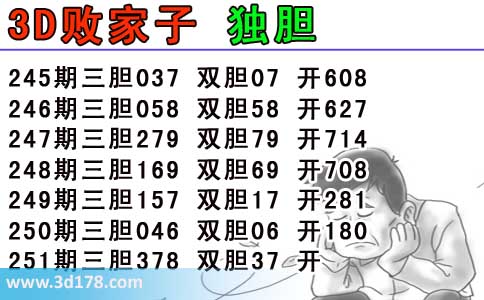 3d之家第2014251期3d败家子独胆图详解: 245期三胆037 双胆07 开608246期三胆058 双胆58 开627247期三胆279 双胆79 开714248期三胆169 双胆69 开708249期三胆157 双胆17 开281250期三胆046 双胆06 开180251期三胆378 双胆37 开