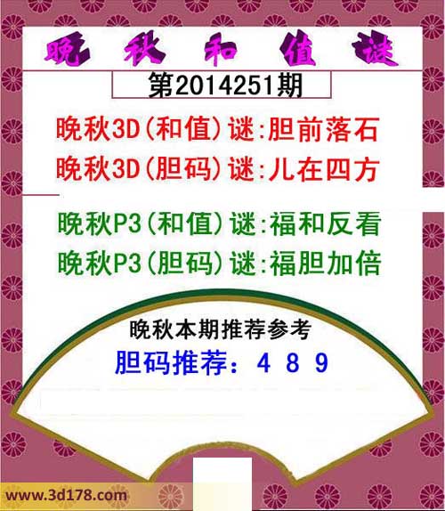 晚秋3D(和值)谜:胆前落石晚秋3D(胆码)谜:儿在四方晚秋P3(和值)谜:福和反看晚秋P3(胆码)谜:福胆加倍胆码推荐:489