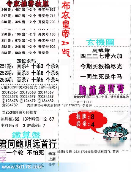 3d第2014253期布衣天下皇帝详解: 专家推荐独胆:253期:560 出1-2个 开奖号 定位杀码:百位杀7 十位杀5 个位杀4第253期冷热号码推荐:热码值:62 13冷码值:12 67主打码:6 3解冻码:7 3d布衣皇帝玄机诗:四三三七带六加今期买猴输尽光一同生死是牛马 该布衣图库由福彩3D之家3D图库频道原创,仅供彩民参考,温馨提供。