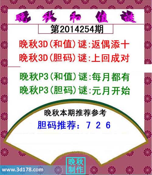 晚秋3D(和值)谜:返偶添十晚秋3D(胆码)谜:上回成对晚秋P3(和值)谜:每月都有晚秋P3(胆码)谜:元月开始胆码推荐:726