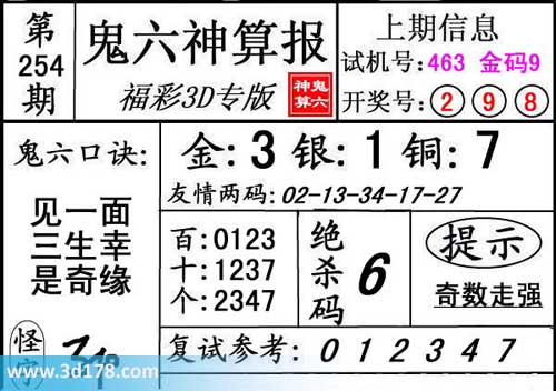 三码推荐:金胆:3,银胆:1,铜胆:7