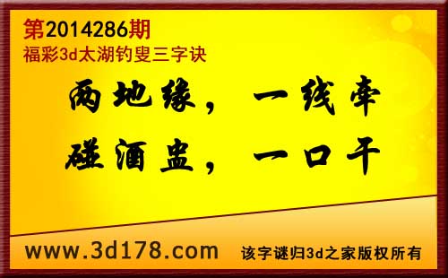 福彩3d第2014286期太湖图库: 两地缘:明码推荐2,解2有0; 一线牵:一条红绳子,看1解7; 碰酒盅:酒谐音9,有9防8; 一口干:干有3划,看3解5; 五码复式:12379(含组三) 组选10注:136 145 179 589 789 129 598 234 156 208 3d太湖图库由3D之家3D图库频道原创,仅供彩民参考,温馨提供。