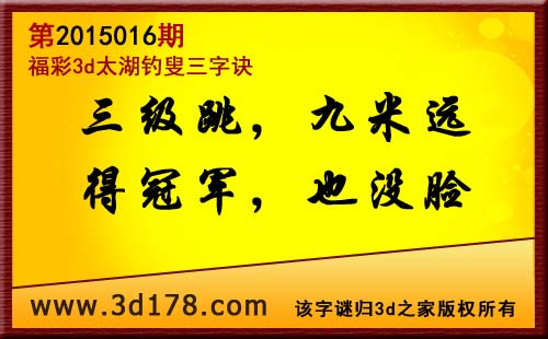 福彩3d第2015016期太湖图库:三级跳:明码推荐3,解3有7; 九米远:跳了9米,看9解0; 得冠军:冠军就是第一名,解1看8; 也没脸:没有就是无的意思,解0有5;五码复式:01379(含组三) 组选10注:139 145 574 456 058 135 146 328 589 908