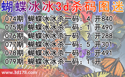 3d第2015079蝴蝶冰冰杀码图:3d第2015079蝴蝶冰冰杀码图:074期 蝴蝶冰冰杀一码:4 开840075期 蝴蝶冰冰杀一码:1 开490076期 蝴蝶冰冰杀一码:7 开288077期 蝴蝶冰冰杀一码:5 开301078期 蝴蝶冰冰杀一码:8 开491079期 蝴蝶冰冰杀一码:1 开该蝴蝶冰冰杀码图由3D之家3D图库频道原创,仅供彩民参考,温馨提供。