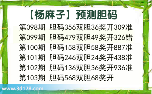 3d第2015103杨麻子图: 3d第2015103杨麻子推荐:第098期 胆码356双胆36奖开309准第099期 胆码479双胆49奖开326错第100期 胆码158双胆58奖开887准第101期 胆码246双胆24奖开438准第102期 胆码136双胆36奖开936准第103期 胆码568双胆68奖开杨麻子图库由3D之家3D图库频道原创,仅供彩民参考,温馨提供。
