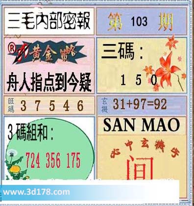 3d第2015103期三毛内部密报图:3d第2015103期三毛内部密报推荐:黄金策略:舟人指点到今疑三码:1503码组合:724 356 175玄机:31+97=92必中玄机字:间该三毛内部密报图库由3D之家3D图库频道原创,仅供彩民参考,温馨提供。