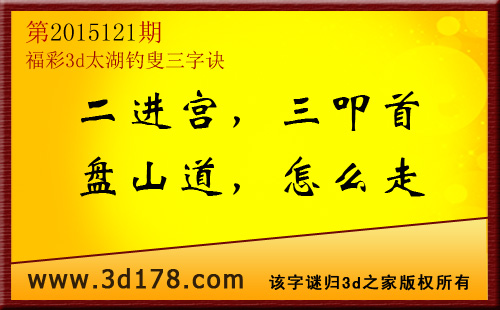 3d第2015121期太湖图库解字谜:福彩3d第2015121期太湖图库:二进宫:两次进宫,解2看7; 三叩首:三叩九拜,看3有9; 盘山道:盘山公路,解0; 怎么走:不知道怎么走,解5有6;五码复式:23679(含组三) 组选10注:023 236 237 367 679 056 057 239 256 5673d太湖图库有3D之家3D图库频道原创,仅供彩民参考,温馨提供。