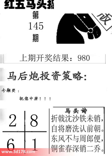 3d第2015145期红五马头报详解:上期开奖号码:980马头诗:折戟沉沙铁未销,自将磨洗认前朝。 东风不与周郎便,铜雀春深销二乔。 该红五图库由福彩3D之家3D图库频道原创,仅供彩民参考,温馨提供。