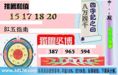 3d第2015146期红五玄机图详解:推荐和值:15 17 18 20独胆必博:387 965 594四字记之曰:八万四千该红五图库由福彩3D之家3D图库频道原创,仅供彩民参考,温馨提供。