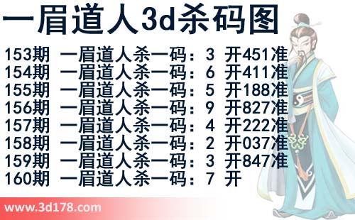 3d第2015160期一眉道人3d杀码图:3d第2015160期一眉道人3d杀码图详解:153期 一眉道人杀一码:3 开451准154期 一眉道人杀一码:6 开411准155期 一眉道人杀一码:5 开188准156期 一眉道人杀一码:9 开827准157期 一眉道人杀一码:4 开222准158期 一眉道人杀一码:2 开037准159期 一眉道人杀一码:3 开847准160期 一眉道人杀一码:7 开该一眉道人3d杀码图由3D之家3D图库频道原创,仅供彩民参考,温馨提供。