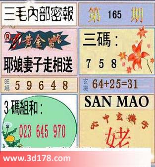 3d第2015165期三毛内部密报:3d第2015165期三毛内部密报推荐:黄金策略:耶娘妻子走相送三码:758旺码:596483码组合:023 645 970玄机:64+25=31必中玄机字:姥该三毛内部密报图库由3D之家3D图库频道原创,仅供彩民参考,温馨提供。