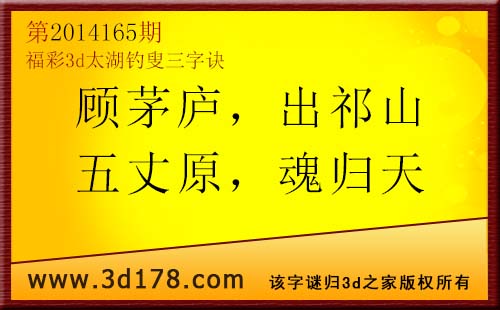 3d第2015165期太湖图库解字谜:福彩3d第2015165期太湖图库:顾茅庐:三顾茅庐请诸葛亮;解3防7;出祁山:诸葛亮六出祁山,看3有6;五丈原:五丈原战场,解5;魂归天:魂归西天,解4有0;五码复式:03456(含组三) 组选10注:034 345 356 037 047 057 067 367 347 5673d太湖图库由3D之家3D图库频道原创,仅供彩民参考,温馨提供。