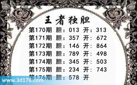 福彩3d第176期王者胆码图:本期王者胆码图详细内容:第170期 胆:013 开:313第171期 胆:357 开: 672第172期 胆:146 开: 864第173期 胆:789 开: 498第174期 胆:345 开: 503第175期 胆:234 开: 743第176期 胆:578 开王者独胆图库由3d之家3D图库频道原创,仅供彩民参考,温馨提供。