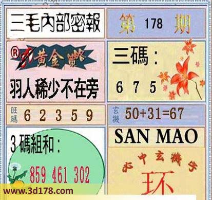 3d之家第15178期三毛内部密报图:福彩3d本期三毛内部密报详情如下:黄金策略:羽人稀少不在旁三码:675旺码:623593码组合:859 461 302玄机:50+31=67必中玄机字:环该三毛内部密报图库由3D之家3D图库频道原创,仅供彩民参考,温馨提供。