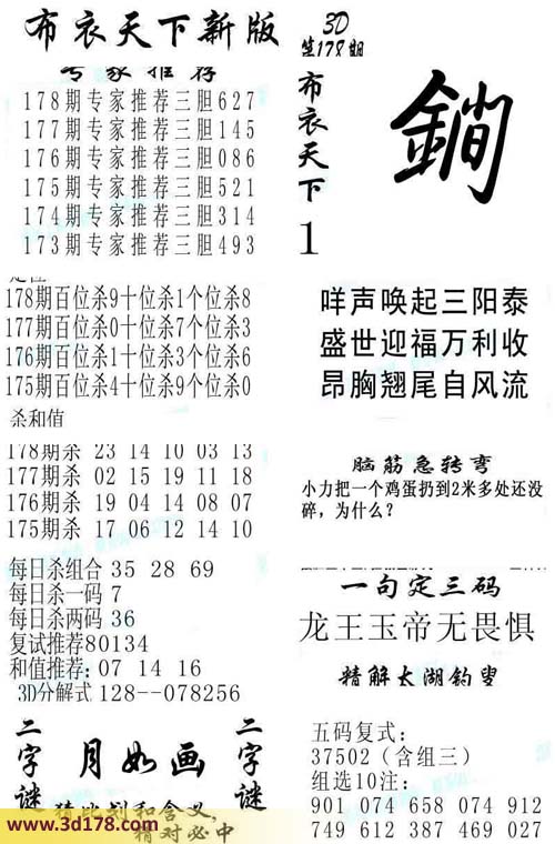 第2015178期福彩3d专家布衣天下新版:本期布衣天下新版详细内容如下:定位杀号推荐:百位杀9 十位杀1 个位杀8杀和值推荐:23 14 10 03 13每日杀组合:35 28 69每日杀一码:7每日杀两码:36复式推荐:80134和值推荐:07 14 163d分解式:128-0782563d布衣图库玄机诗:咩声唤起三阳泰盛世迎福万利收昂胸翘尾自风流一句定三码:龙王玉帝无畏惧该布衣图库由福彩3D之家3D图库频道原创,仅供彩民参考,温馨提供。