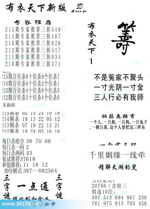 第2015215期福彩3d专家布衣天下新版专家推荐如下: