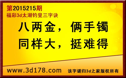 福彩3d第2015215期太湖图库解析:八两金:八两的金子,解8有4;俩手镯:做两个手镯,解2有0;同样大:两个一般大,解3防组三;挺难得:此喜事难得,解4有1。
