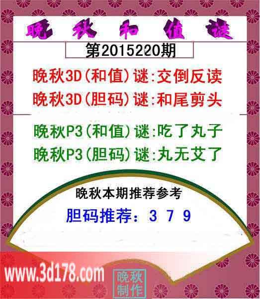 第15220期福彩3d红五图为您推荐和值以及组选:3d第2015220红五晚秋推荐详情:晚秋3D(和值)谜:交倒反读晚秋3D(胆码)谜:和尾减头晚秋P3(和值)谜:吃了丸子晚秋P3(胆码)谜:丸无艾了胆码推荐:379该红五图库由3d之家3D图库频道原创,仅供彩民参考,温馨提供。
