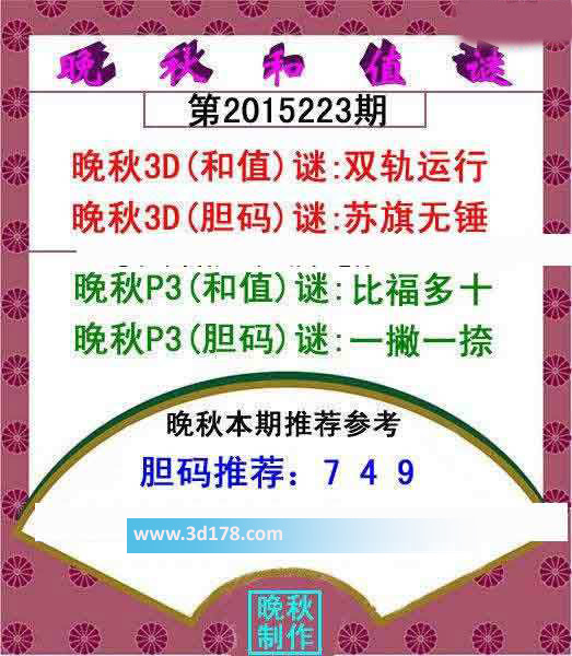 3d第2015223红五晚秋推荐详情:晚秋3D(和值)谜:双轨运行晚秋3D(胆码)谜:苏旗无锤晚秋P3(和值)谜:比福多十晚秋P3(胆码)谜:一撇一捺胆码推荐:749
