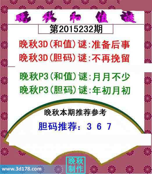 3d第2015232红五晚秋推荐详情:晚秋3D(和值)谜:准备后事晚秋3D(胆码)谜:不再挽留晚秋P3(和值)谜:月月不少晚秋P3(胆码)谜:年初月初胆码推荐:367