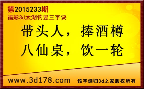 福彩3d第2015233期太湖图库解析:带头人:带头人者,解9有1;捧酒樽:捧酒敬众,解2有9;八仙桌:八仙团聚,解8有4;饮一轮:各饮一杯,解0有8。六码复式:012489(含组三)