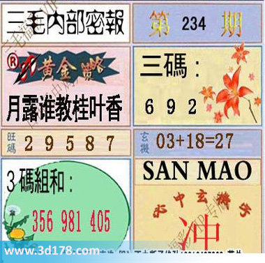 3d之家三毛图库第234期三毛内部密报图详解:黄金策略:月露谁教桂叶香三码:692旺码:295873码组合:356 981 405玄机:03+18=27必中玄机字:冲 该三毛内部密报图库由3D之家3D图库频道原创,仅供彩民参考,温馨提醒。