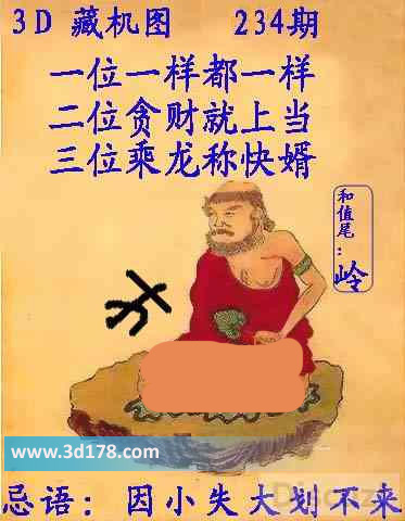 福彩3d第234期藏机图详情如下:一位:一样都一样二位:贪财就上当三位:乘龙称快婿和尾:岭忌语:因小失大划不来 以上是3d之家为您提供的晚间版藏机图,正版藏机图请于次日上午进行关注。