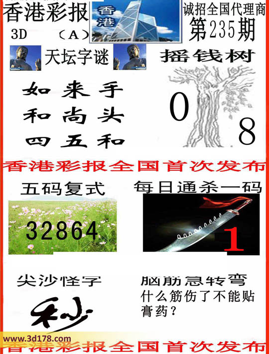 本期3d香港彩报图详情如下: 天坛字谜:如来手,和尚头,四五和。摇钱树:0 8五码复式:32864每日通杀一码:1尖沙怪字:秒脑筋急转筋:什么筋伤了不能贴膏药
