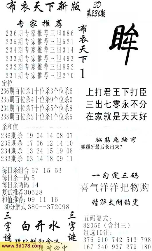 第2015236期福彩3d布衣天下新版专家推荐如下: