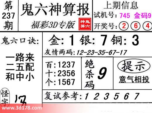 鬼六神算报3d第237期分析如下:
