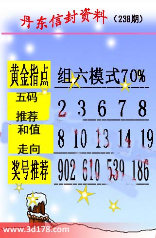 第2015238期丹东信封资料推荐:黄金指点:组三模式70% 五码推荐:23678和值走向:8 10 13 14 19奖号推荐:902 610 539 186该丹东图库由3D之家3D图库频道原创,仅供彩民参考,温馨提供。