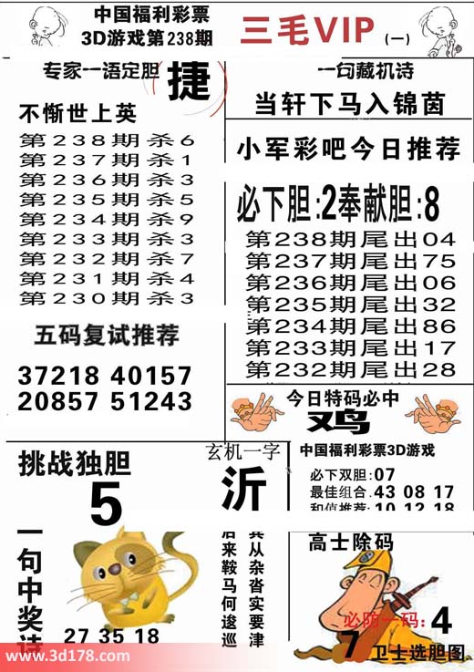 第2015238期3d三毛图库为您解读本期三毛VIP:3d第2015238期三毛图库VIP详解:一句藏机诗:当轩下马入锦茵第2015238期杀一码推荐:6必下双胆:07 挑战独胆:5 五码复式推荐:37218 40157 20857 51243今日特码必中:鸡最佳组合:43 08 17和值推荐:10 12 18玄机一字:沂该三毛玄机解码图由福彩3D之家3D图库频道原创,仅供彩民参考,温馨提供。