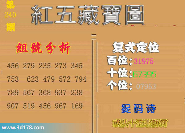 3d之家3d红五藏宝图第2015240期为您推荐复式定位、捉码诗以及组号分析:复式定位:百位:31975十位:67395个位:07953捉码诗:或从十五北防河组号分析:456 279 235 273 345 753 623 479 572 794789 567 368 937 238 907 519 456 967 169 红五图库由3D之家3D图库频道原创,仅供彩民参考,温馨提供。