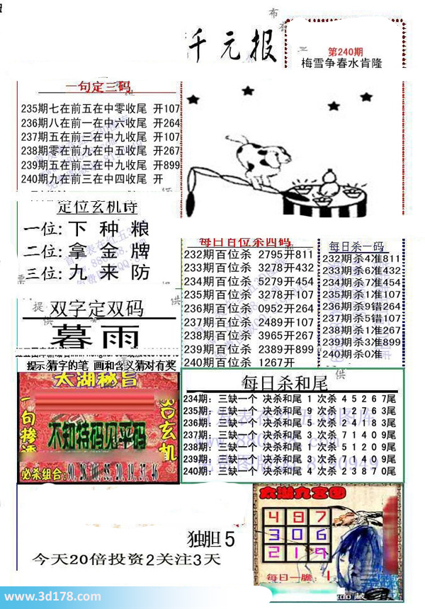 福彩3d布衣图库布衣千元报第2015240期定位玄机诗: 福彩3d第2015240期布衣千元报图详情分析如下:一句定三码:240期九在前三在中四收尾定位玄机诗:一位:下种粮二位:拿金牌三位:九来防每日百位杀四码:240期百位杀1267每日杀一码:240期杀0每日杀和尾240期:三缺一个 决杀和尾4 次杀23870尾 该布衣图库由福彩3D之家3D图库频道原创,仅供彩民参考,温馨提供。