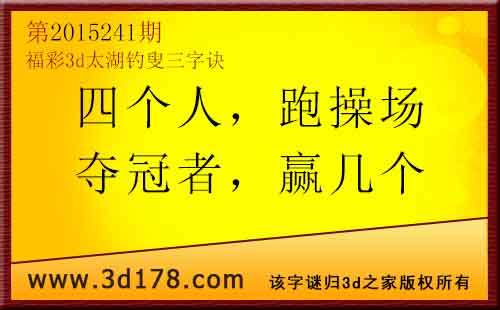 福彩3d第2015241太湖图库解析:四个人:明码推荐4,解4有8;跑操场:双腿跑,看2解4;夺冠军:第一名,解1防5;赢几个::赢几个人,解3有1;