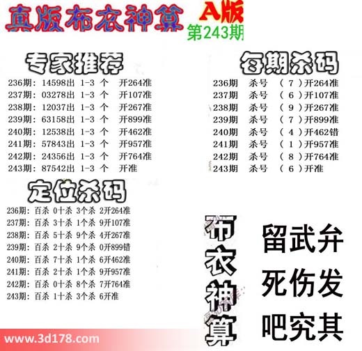 3d之家布衣图库之布衣神算图第2015243期详解:专家推荐:243期:87542出 1-3 个 定位杀码:243期:百位杀1 十位杀3 个位杀6每期杀码:243期杀一码6布衣神算:留武弁,死伤发,吧究其该布衣图库由福彩3D之家3D图库频道原创,仅供彩民参考,温馨提供。