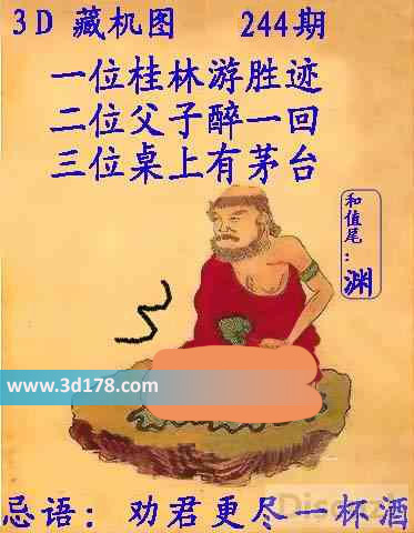 福彩3d第244期藏机图详情如下:一位:桂林游胜迹二位:父子醉一回三位:桌上有茅台和尾:渊忌语:劝君更尽一杯酒