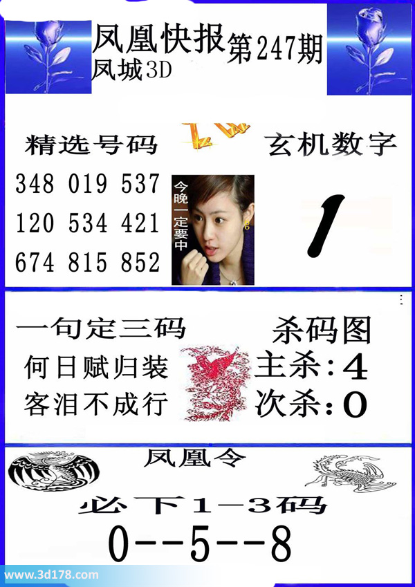 玄机数字:1精选号码:348 019 537 120 534 421 674 815 853一句定三码:何日赋归装客泪不成行杀码图:主杀:4 次杀:0凤凰令:必下1-3码,0-5-8