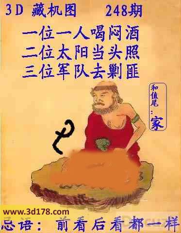 3d之家正版藏机图第15248期忌语:3d第2015248期正版藏机图详解:一位:一人喝闷酒二位:太阳当头照三位:军队区剿匪和尾:家忌语:前看后看都一样3d正版藏机图由3D之家3D图库频道原创,仅供彩民参考,温馨提供。