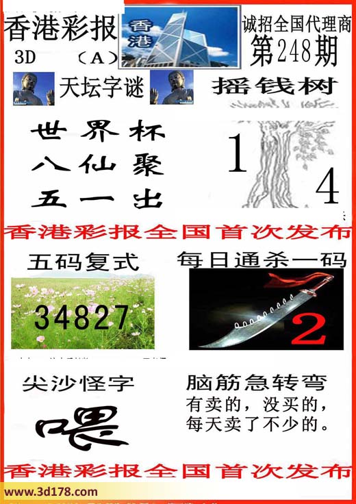 3d之家本期3d香港彩报图详情如下:天坛字谜:世界杯,八仙聚,五一出。摇钱树:1 4五码复式:34827每日通杀一码:2尖沙怪字:喂脑筋急转筋:有卖的,没买的,每天卖了不少的。该香港彩报由福彩3D之家3D图库频道原创,仅供彩民参考,温馨提供。