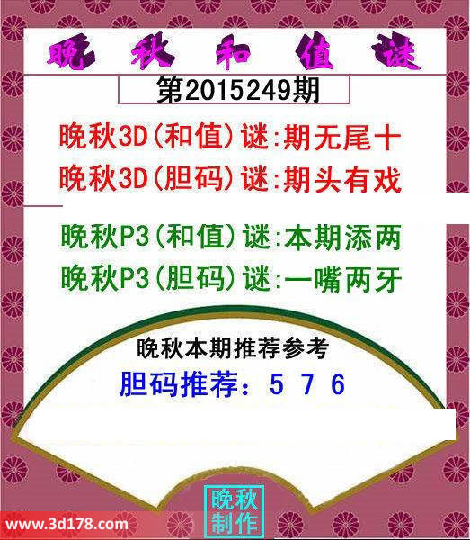 晚秋P3(和值)谜:本期添两