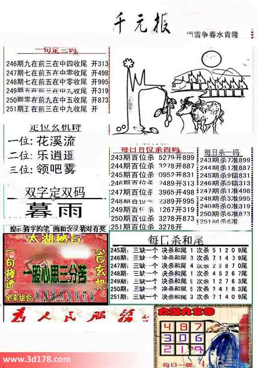 3d布衣图库布衣千元报第2015251期定位玄机诗:福彩3d第2015251期布衣千元报图详情分析如下:一句定三码:251期五在前三在中九收尾一位:花溪流二位:乐逍遥三位:领吧雾每日百位杀四码:251期百位杀3278每日杀一码:251期杀6每日杀和尾251期:三缺一个 决杀和尾3 次杀71409尾