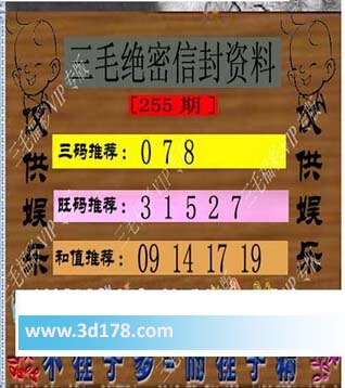 3d之家第2015255期三毛绝密信封资料图:福彩3d第255期三毛绝密信封资料图详解:三码推荐:078旺码推荐:31527和值推荐:09 14 17 19三毛图库由3D之家3D图库频道原创,仅供彩民参考,温馨提供