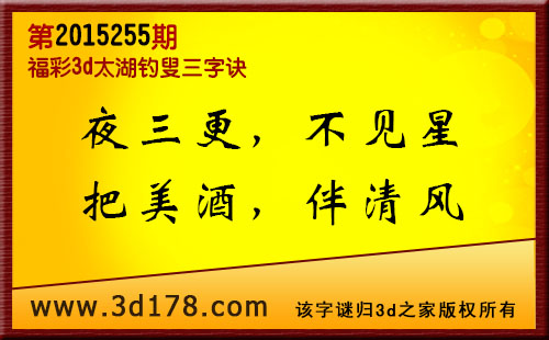 第2015255期3d太湖图库解太湖钓叟三字诀:福彩3d第255期太湖图库解析:夜三更:夜半三更,看3解1;不见星:看不见天上的星星,解4看0;把美酒:独自喝美酒,有0解9。伴清风:伴随着清风,解7防4;六码复式:013479(含组三) 组选10注:134 017 019 179 047 479 147 149 049 3793d太湖图库由3D之家3D图库频道原创,仅供彩民参考,温馨提供。