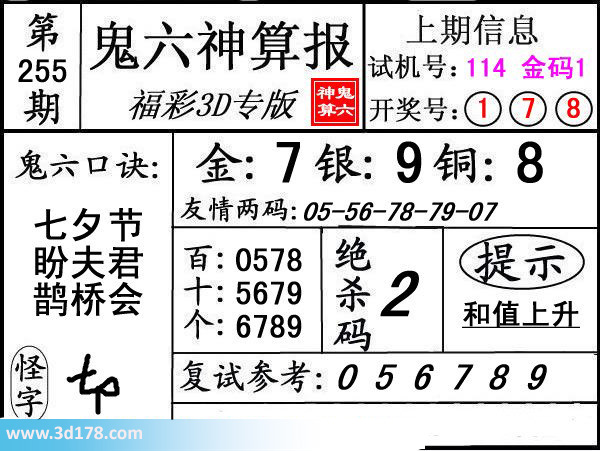 3d之家3d鬼六神算报第255期分析如下:鬼六口诀:七夕节,盼夫君,鹊桥会。友情两码:05-56-78-79-07复式参考:056789三码推荐金胆:7,银胆:9,铜胆:8定位复式:百位:0578十位:5679个位:6789